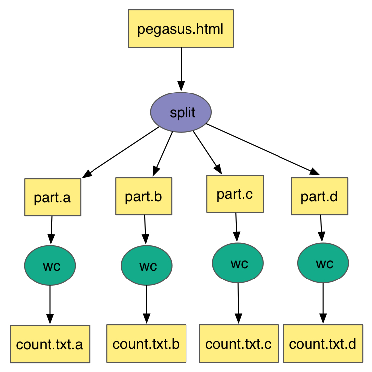 All of the example workflows described in the previous section can be generated with the pegasus-init command. For this tutorial we will be using the split workflow, which can be created like this: